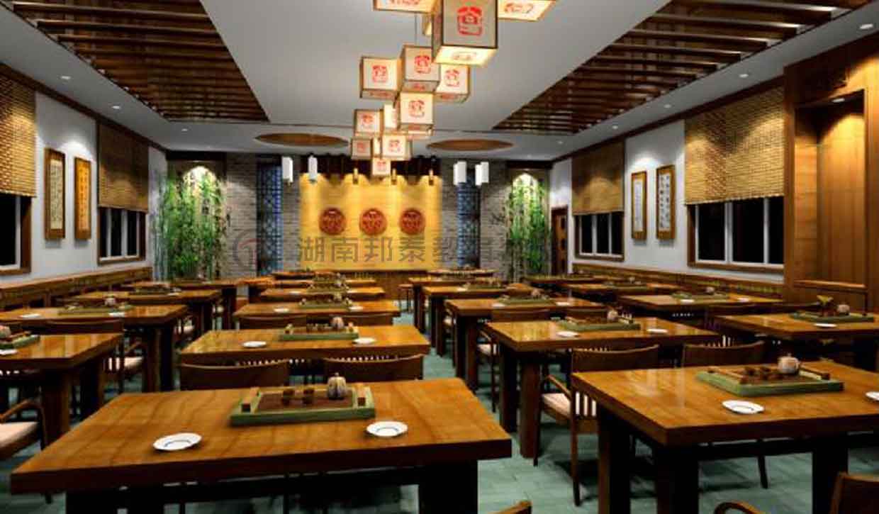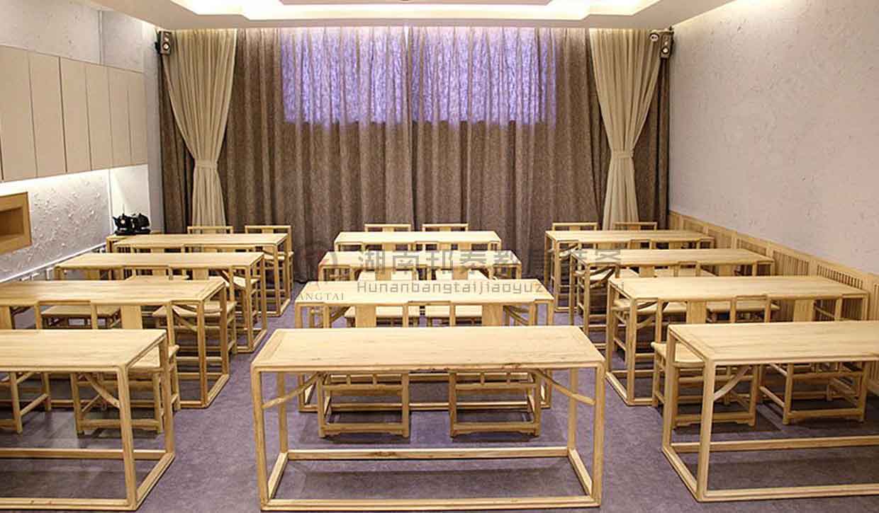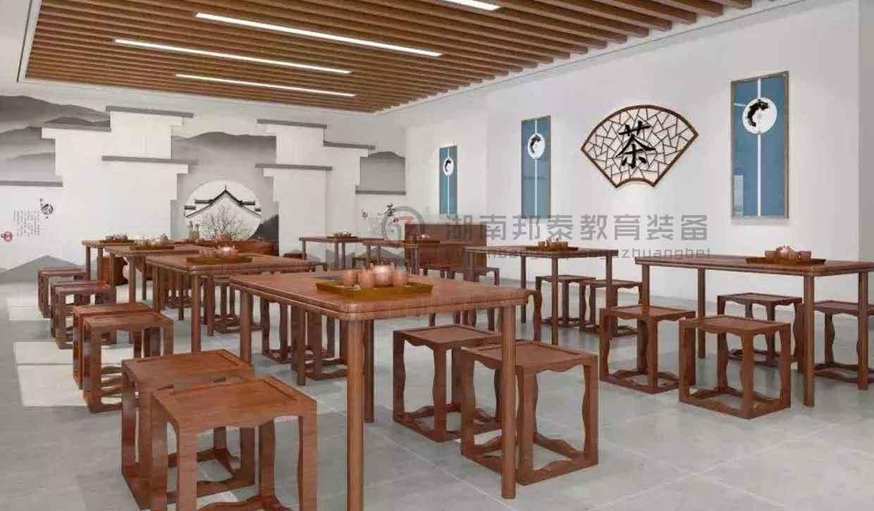 古風(fēng)桌椅,配套的茶具整齊的擺放在桌子上,墻邊放置木質(zhì)展覽架,墻壁上可掛有品茗壁畫與茶藝文房墨寶,調(diào)以暖色調(diào)的燈光,獨特的飲茶氛圍油然而生。