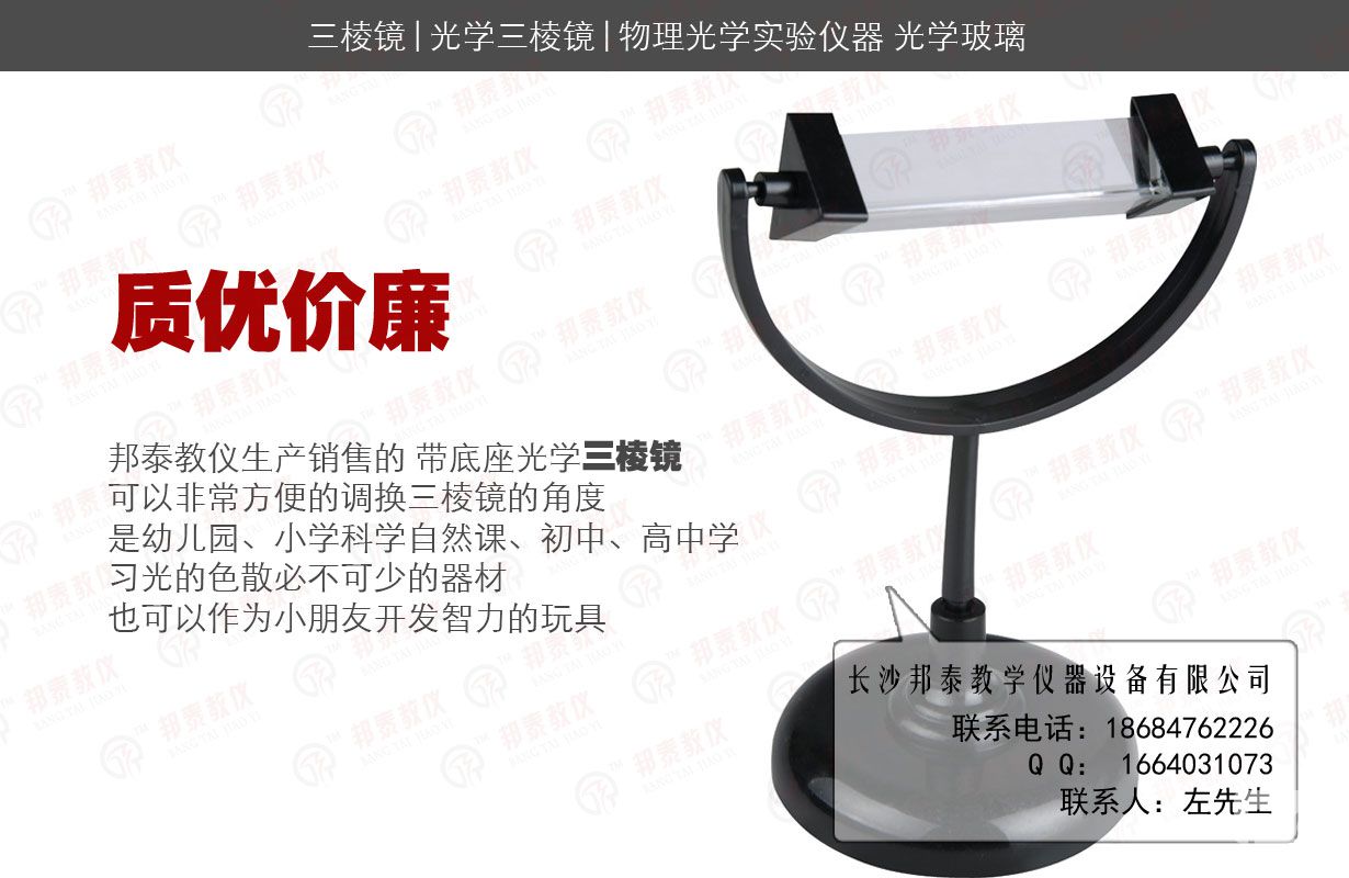 【用途】:帶底座光學(xué)三棱鏡,可以非常方便的調(diào)換三棱鏡的角度,是幼兒園、小學(xué)科學(xué)自然課、初中、高中、學(xué)習(xí)光的色散必不可少的器材,也可以作為小朋友開發(fā)智力的玩具,三棱鏡比較大,可以作為學(xué)校老師課堂演示實(shí)驗(yàn)用。